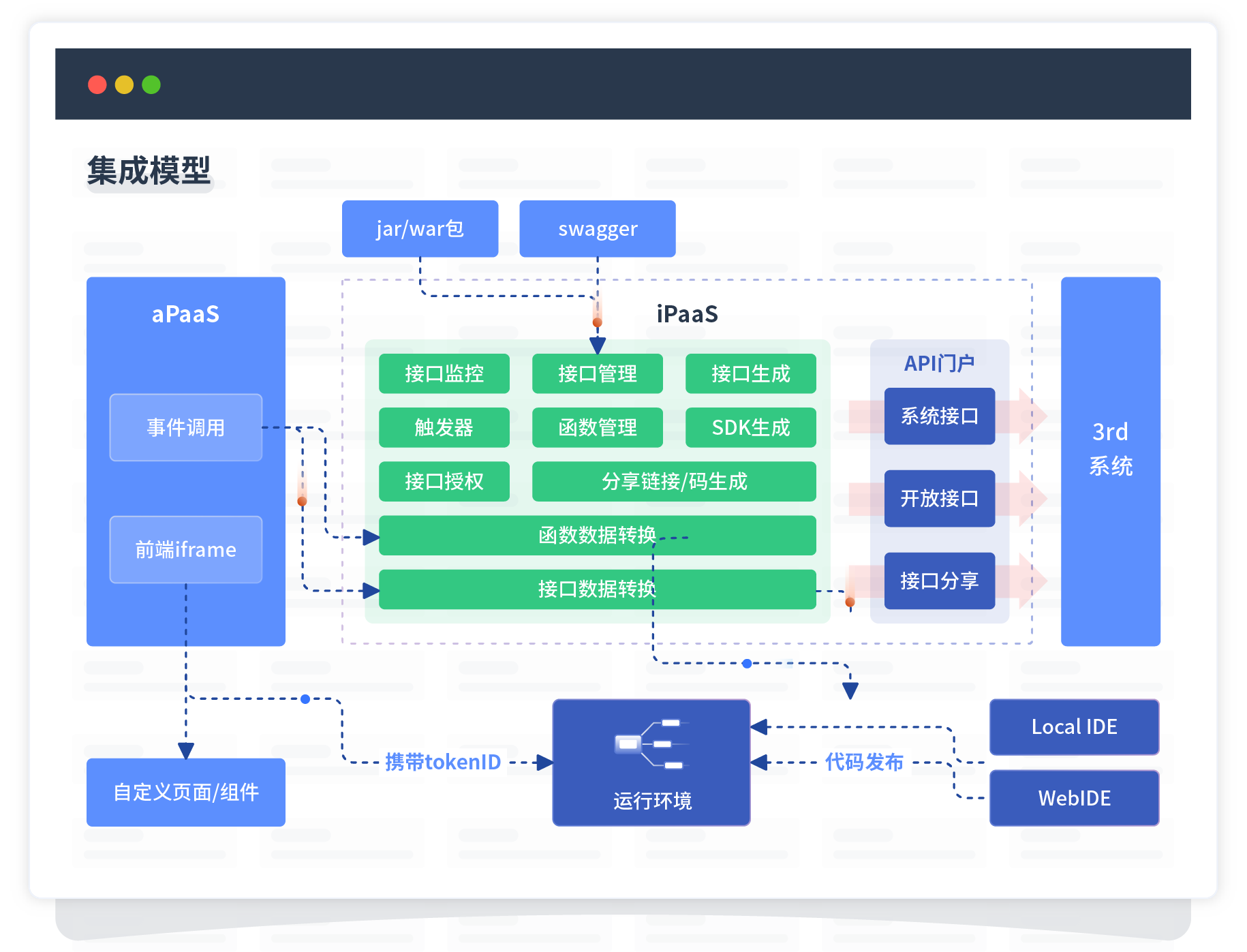集成模型包括平台本身前、、、、后端能力的扩展,,,,也支持通过API门户和第三方系统进行交互。。。。