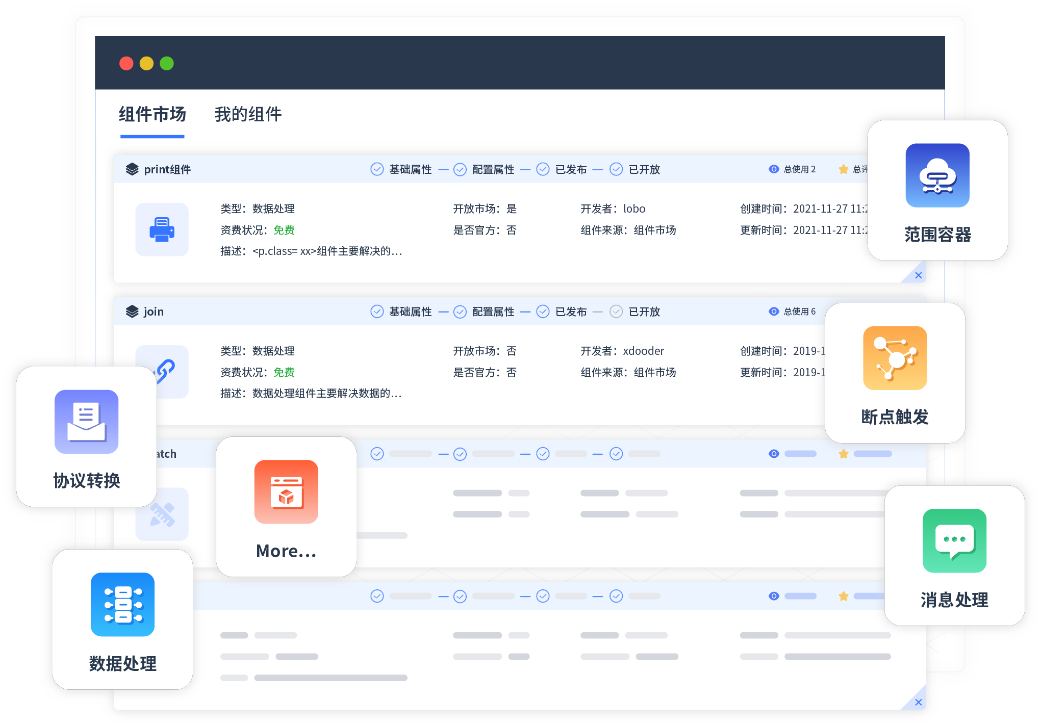 针对集成场景,,,GOPAY钱包提供组件市场,,,例如协议转换、、、、消息处理、、、文件操作等。。。。除平台提供的组件外,,,客户可以自定义所需组件。。