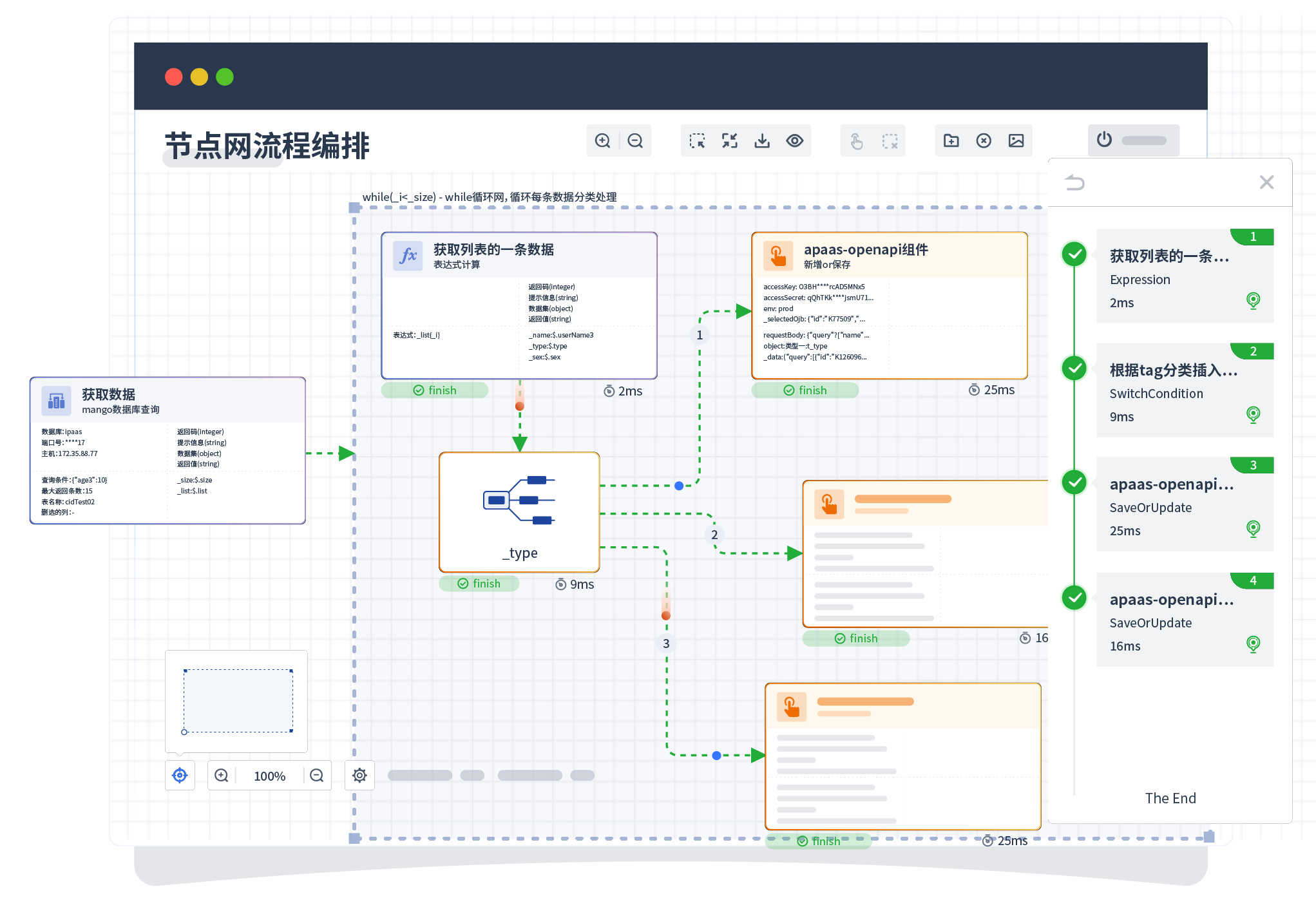针对集成场景,,,,组件定义后支持进行流程编制,,,,不同于传统代码方式,,通过图形化展示,,支持在线调试、、日志查看和运行回放。。。。