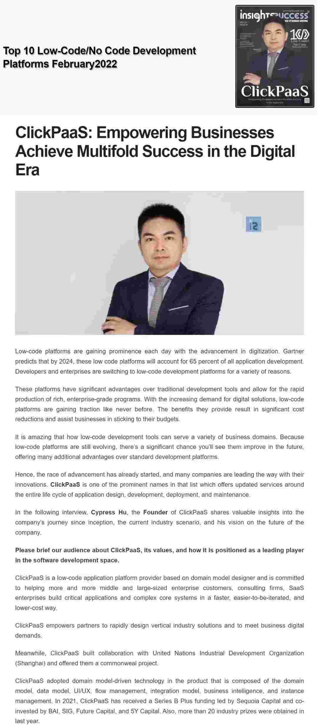 2022年年初,,GOPAY钱包入选外媒Insights Success低代码/无代码开发平台 Top10,,,,创始人、、、CEO胡柏受邀接受专访并荣登封面人物,,,,他与Insights Success的读者分享了GOPAY钱包成立的初心、、、发展历程、、当前的行业发展趋势以及他对公司未来的展望。。。